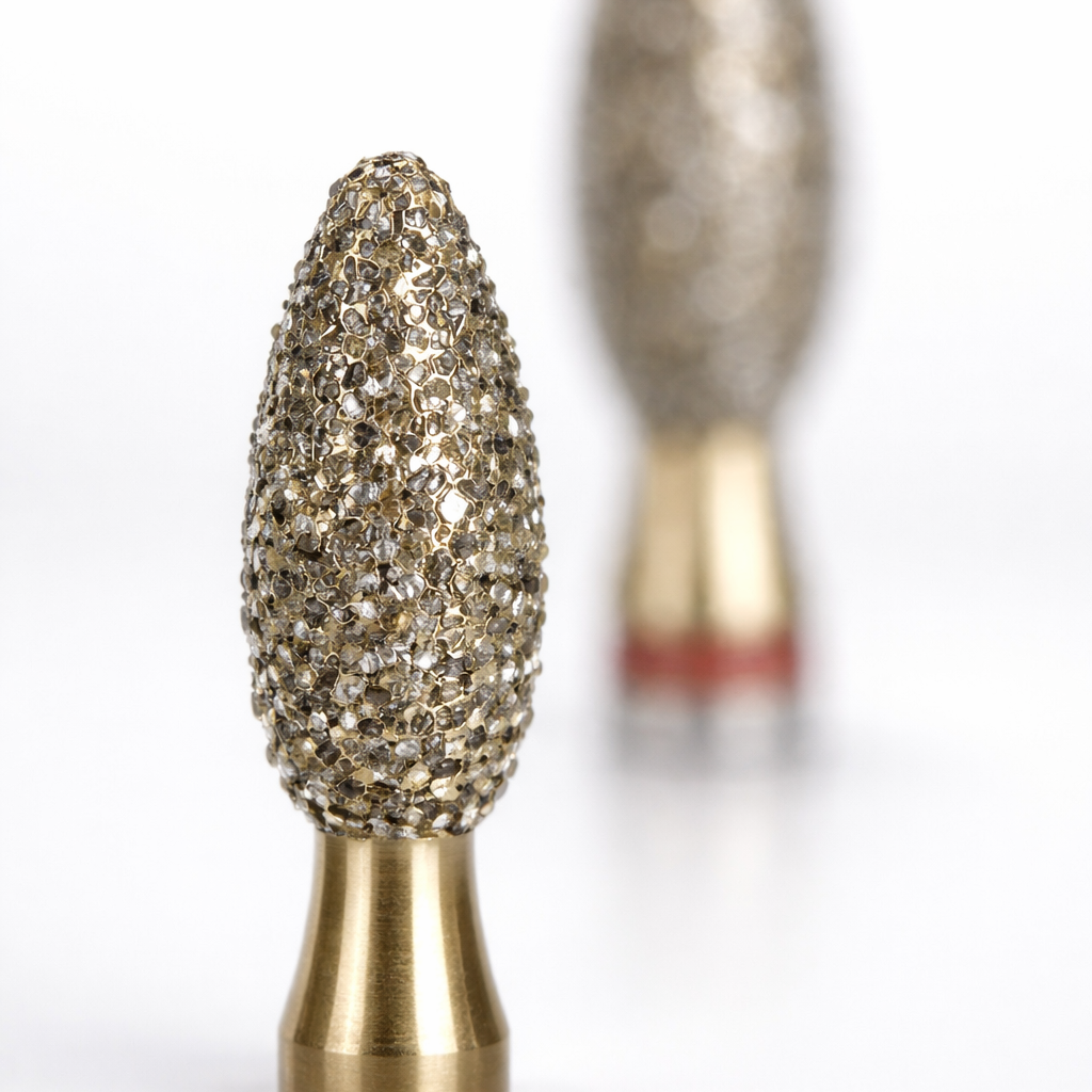 Diamanten, die fast wie Zähne nachwachsen. Repetierbare Diamantbeschichtung in galvanischer Bindungsmatrix.Die mehrlagigen Kornschichten werden von elektrolytisch aufgetragenem Reinnickel fixiert. Ein elektroerosiver Prozess sichert Kühldrainagen für den Substanzabtrag bei der Präparation. Beim Repetieren wird das abgenutzte Diamantkorn freigesetzt; an dessen Stelle tritt ein neues, scharfes Korn.